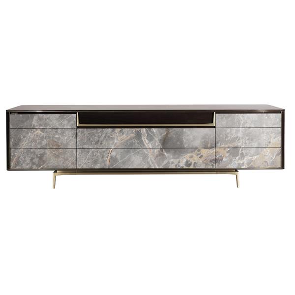 凡爾塞金巖板臺面+環保實木多層板+煙熏尤加利木飾面+304#拉絲黃銅不銹鋼+進口五金